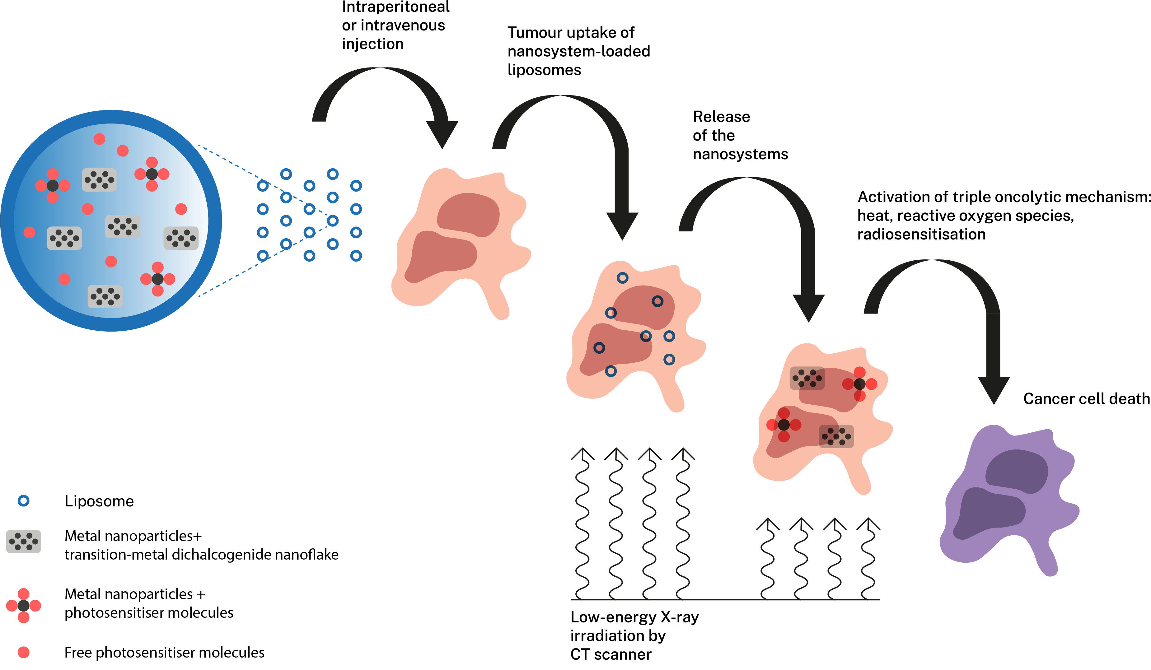 These therapeutic effects are the result of the conversion of low-energy CT X-rays into reactive oxygen species, radiosensitising agents (ROS), and heat. X-ray irradiation can also induce immunogenic cell death with the exposure or release of neo-antigens to trigger an anti-cancer immune response. The use of X-rays makes it possible to reach deep-seated tumours that are inaccessible by conventional visible or near-infrared light-based therapies. In other words, CT radiation is the spark that lights the match. This is a radical vision for an ambitious and high-risk project. The nanosystems are biocompatible and also totally inactive in the absence of CT radiation: nanosystems only become active where the CT beam is delivered – hence minimising side effects at distal sites.